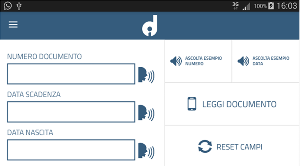 La porzione di MRZ che viene gradualmente letta attraverso la fotocamera del dispositivo, si colora in azzurro mentre nella finestra superiore vengono presentati i caratteri via via acquisiti.